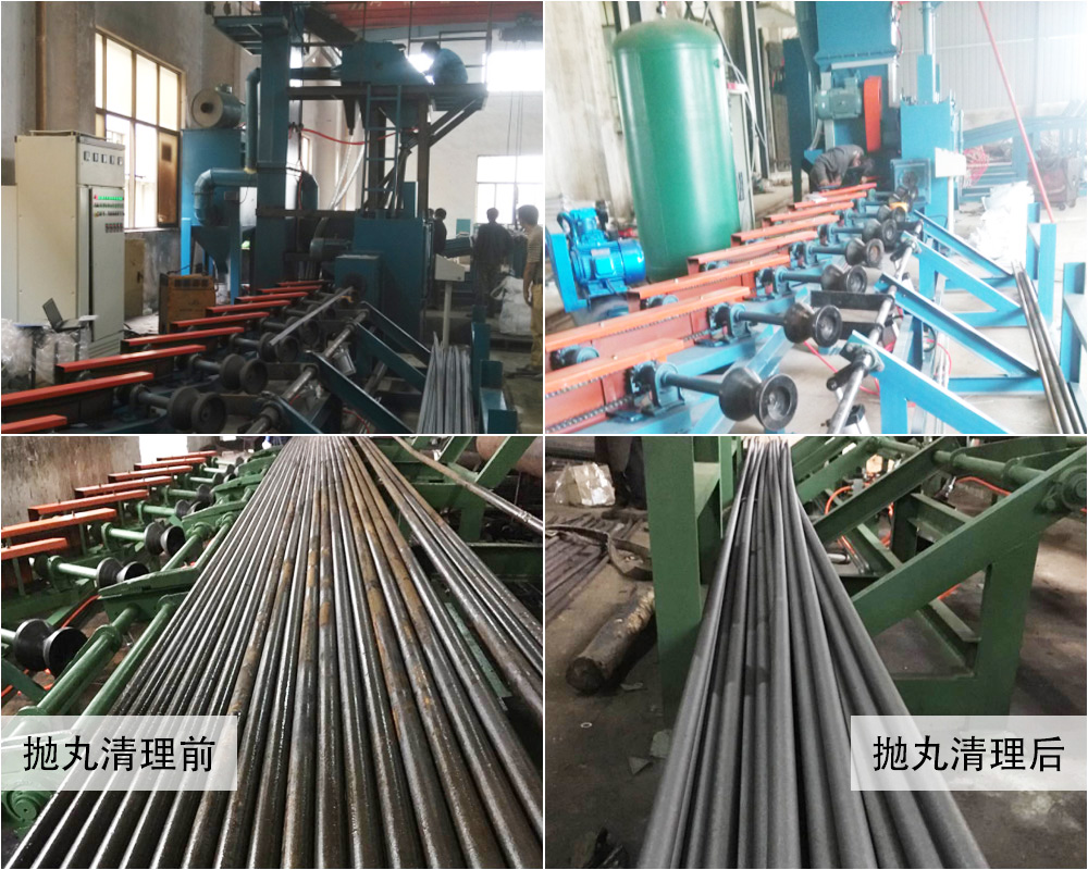 棒材抛丸机主要用于清理圆钢、圆管、方钢、钢筋等型材,对工件表面进行清理和强化,除掉其上的锈层、焊渣及氧化皮,使之获得均匀一致的金属光泽,以提高钢材的涂饰质量与防腐效果。公司针对用户的生产状况设计了两款产品:单根清理抛丸机和多根清理抛丸机,这两种棒材抛丸机都可以工件自动装卸,自动化程度高,不需要人工搬运,提高生产效率,节约成本。为保证对清理工件的严格要求,我们在该抛丸机的方案和设计中采用下述关键技术及保证措施: